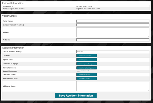 Using our simple to use forms you are able to quickly record the key information of any accidents. The system automatically populates the date, time, incident number and who is reporting the accident. Along with this you are able to specify incident specific information such as:-