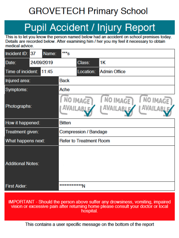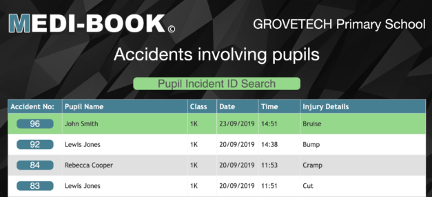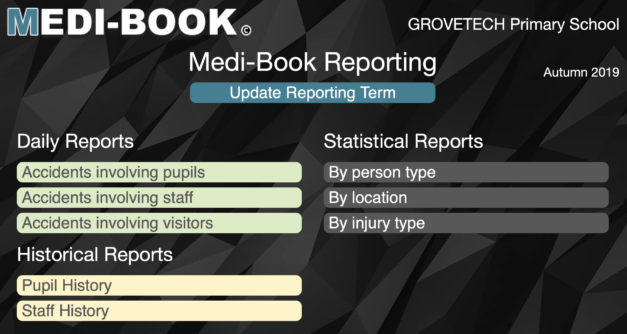 - Pupil or Staff historical reporting – Information on all the accidents which have occurred for an individual person, along with links to display the relevant incident reports.