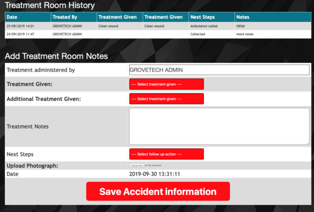 The included treatment room module enables you to record additional information relating to an incident, you can add additional interactions and treatments given, build up a history of all actions performed to help the student, staff member or visitor. Each treatment room interaction is appended to the main incident report, enabling a full history and audit of what has occurred.