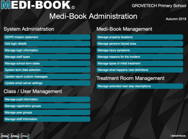 Customising your MEDI-BOOK instance, adding users, pupils, staff and reporting options is made easy with our administration module. In here you can: