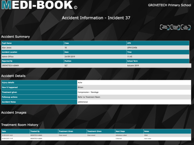No need to keep paying out for accident forms every term, with Medi-Book you’ve a year of unlimited accident reports for more than half the price!, plus your previous data is available for reporting on to provide a full and concise student and staff members accident history whilst at the school.